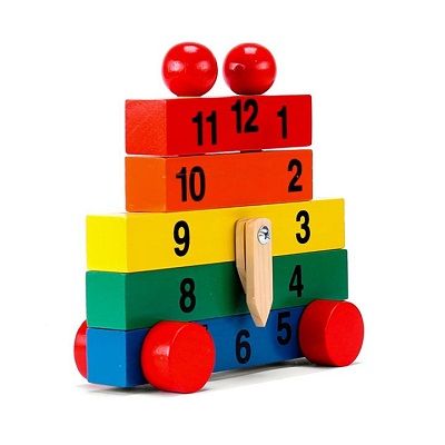 Bằng gỗ sơn màu sắc tươI sáng, gồm các khối hình in số từ 1 đến 12 và ghép với nhau thành đồng hồ.Phù hợp với trẻ từ 3 đến 6 tuổi