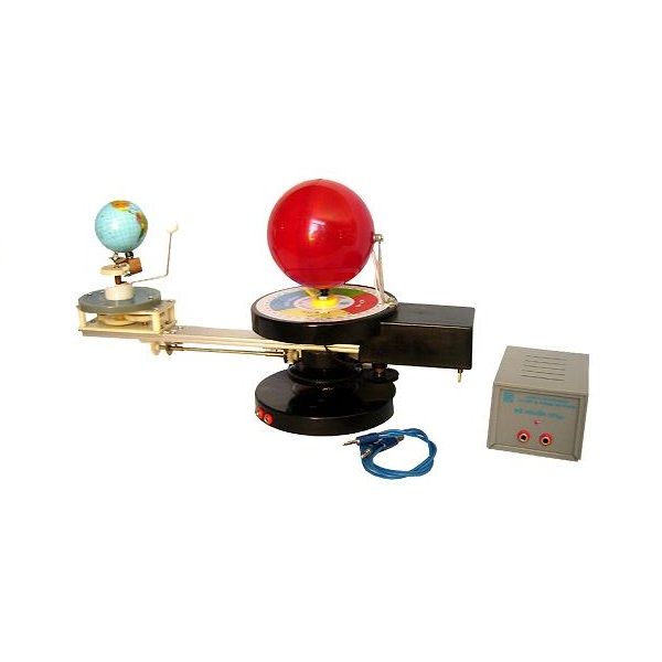 - Vật liệu quả cầu mặt trời, mặt trăng, trái đất bằng nhựa, trái đất được dán giấy in sắc nét màu sắc rõ ràng chuyển động bằng quay tay hoặc dùng nguồn điện 6 V, hoặc pin R20, vật liệu trục dẫn động và bánh răng bằng nhua, có bóng đèn mô phỏng sự chiếu sáng của mặt trời. f mặt trời 10 cm, f trái đất 5,6 cm, f mặt trăng 1,6 cm. Có đĩa bằng nhựa f 14 cm ghi 4 mùa Xuân, Hạ, Thu, Đông. Chiều cao toàn bộ 31 cm, chiều dài toàn bộ 44 cm. Đế nhựa dày 1,6 mm, f 18 cm.
